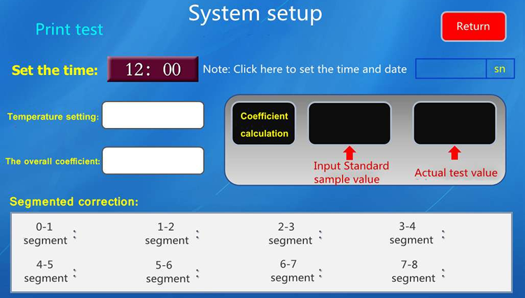 The instrument can be corrected through the touch screen to do overall high or low sulfur.It is equivalent to the internal integral gain potentiometer of old sulfur. The computer displays the coulomb integral count value multiplied by the integral gain coefficient as the result value and participates in the calculation, so as to achieve the overall effect of modifying the overall sulfur result to be higher or lower.If the global gain coefficient K=1.00, the count value will not be changed, and the result value is equal to the count value.If the overall gain coefficient K<1.00, the result value will be less than the calculated value, so as to achieve the overall low sulfur results.If the overall gain coefficient K>1.00, the result value will be greater than the calculated value, so as to achieve the overall high sulfur results. ? When the instrument calibration, want to set the overall coefficient to 1, make the standard coal sample, and then input the standard value of the coal sample made in the standard value box, click "coefficient calculation", the instrument calculates the new coefficient, and automatically write into the overall coefficient box.You can also click the integral coefficient box to manually enter the integral coefficient. Click on the upper right corner to return to the main screen and save the changed parameters.